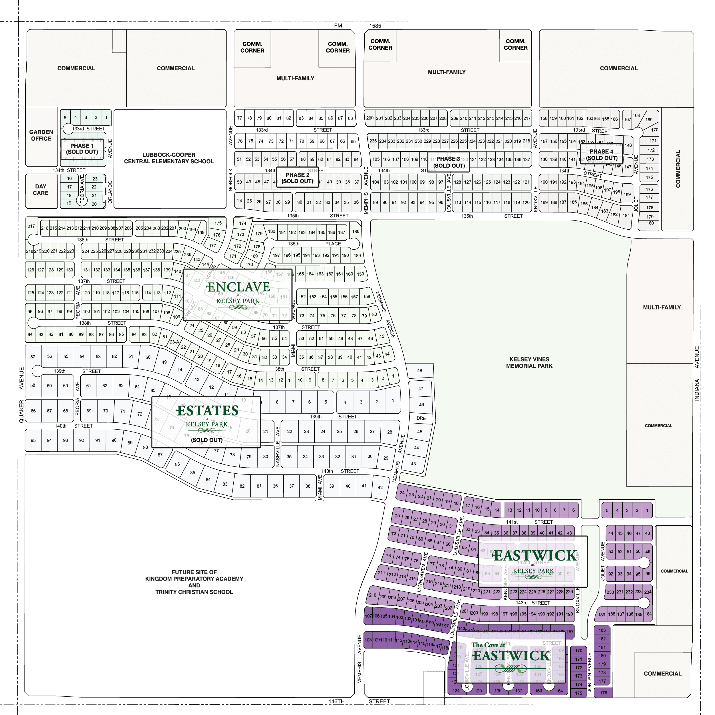 Phase 1 of Eastwick at Kelsey Park is located between 141st and 142nd Streets and between Indiana and Memphis Avenues. The 96 lots were completed in late 2018 and include 24 lots that back to Kelsey Vines Memorial Park.